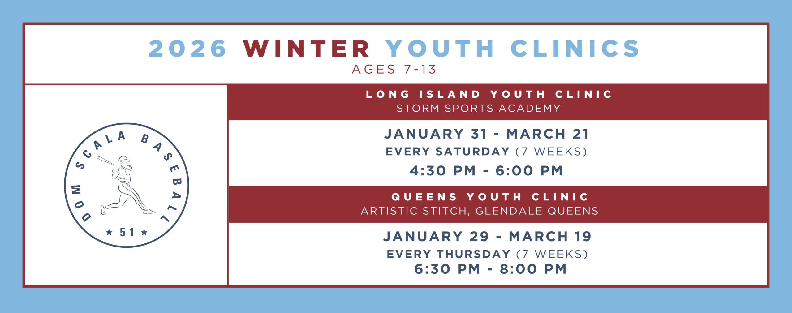 Dom, a former coach for the New York Yankees and A New York State Baseball Hall of Fame Inductee served as the head coach at Adelphi University for 18 years. He now focuses fully on his youth programs and draws upon his 45 years of professional experience as both a player and a coach. According to Scala, “The knowledge I have gained from some of the greatest Major League players, managers and coaches that have influenced my career is immeasurable, and I look forward to sharing that with your child.”